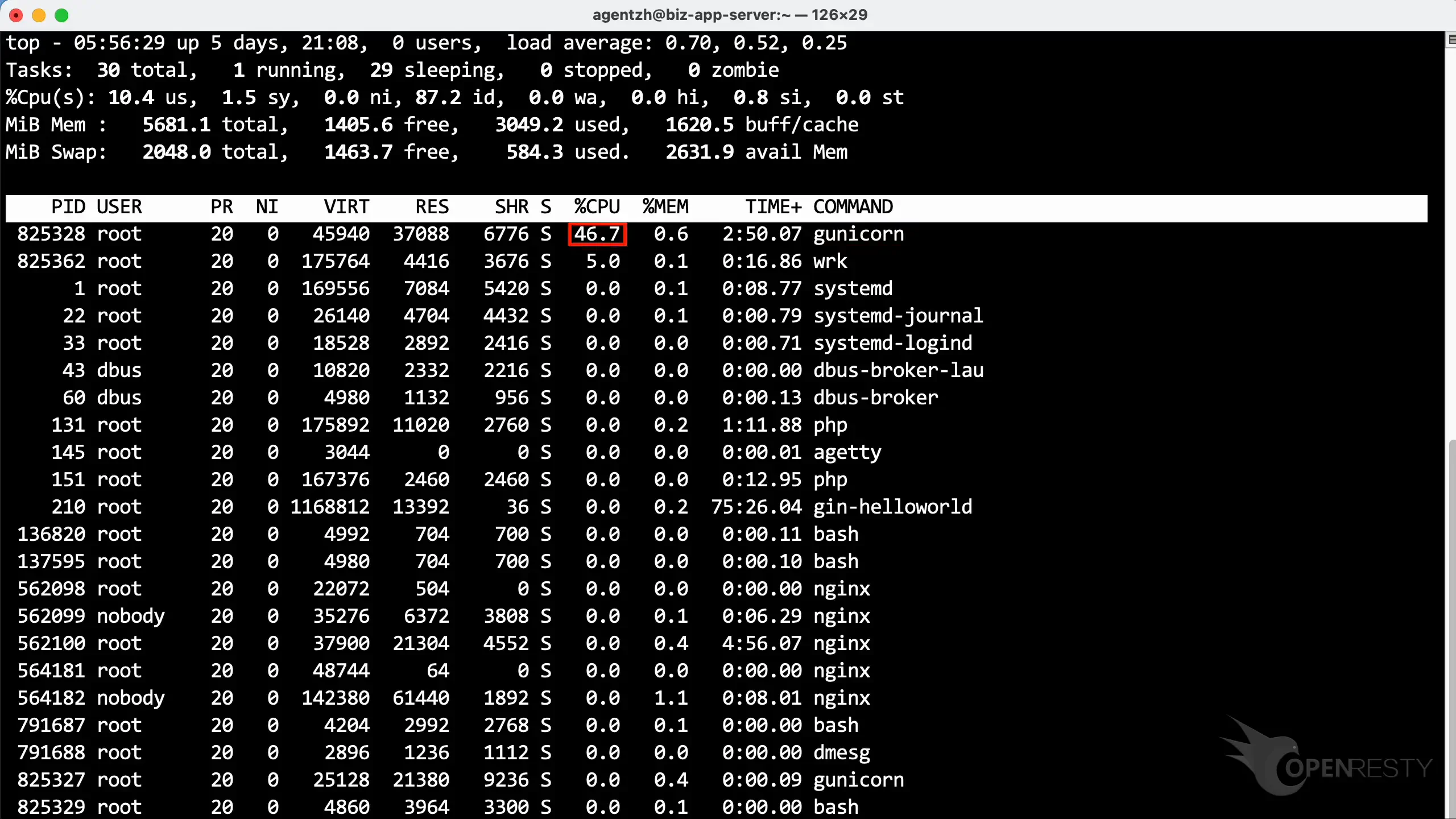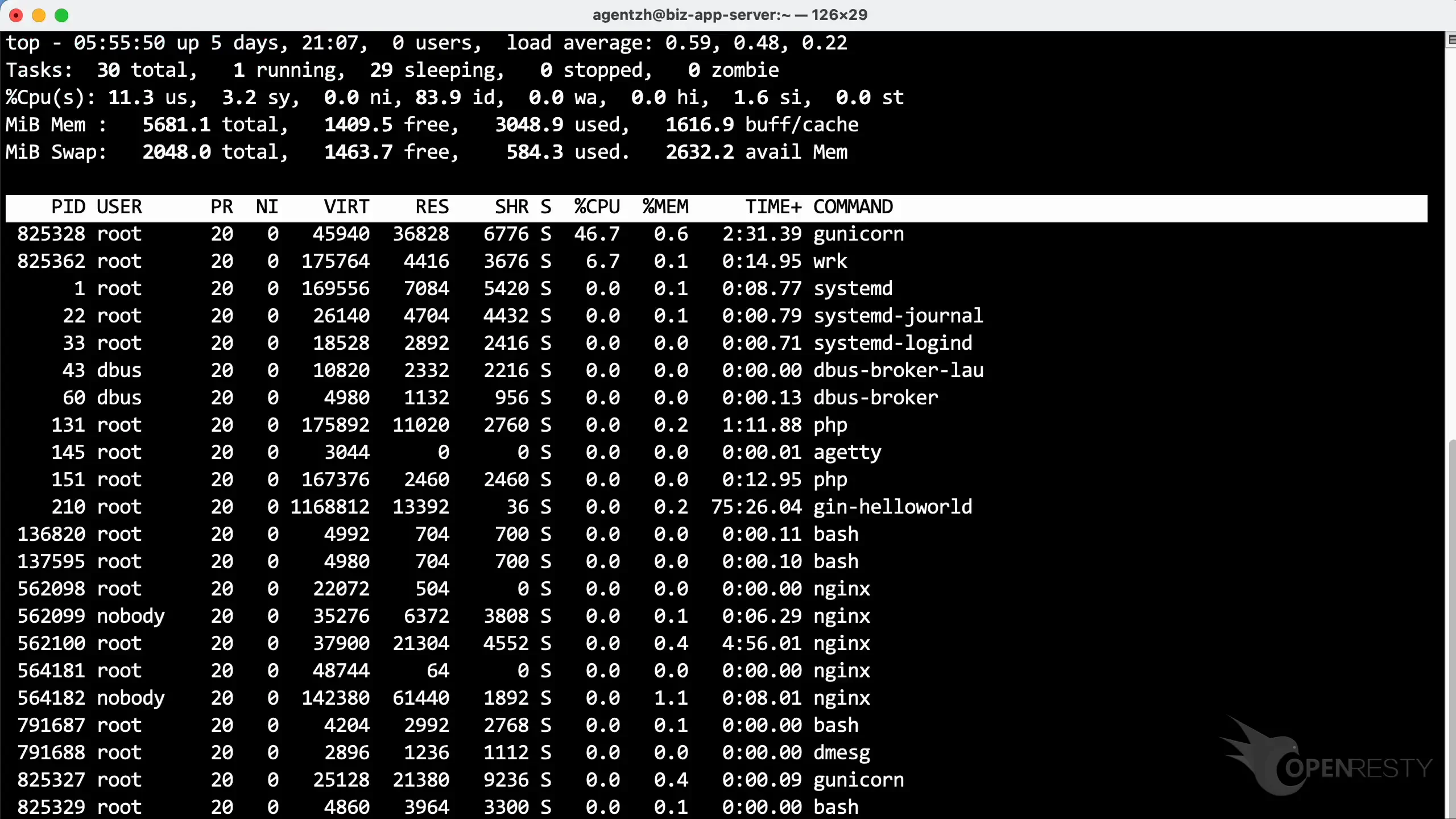 可以看到这个名为 gunicorn 的进程,它是用 Python 编写的应用。