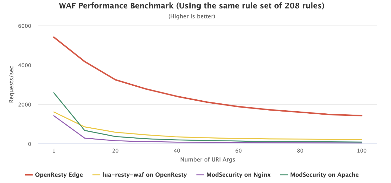 - 极限生存能力:在 100 个参数的极端高负载下,OpenResty Edge 依然保持在 1500 RPS 左右——这个数字比 ModSecurity 在最轻松状态下的表现还要好。