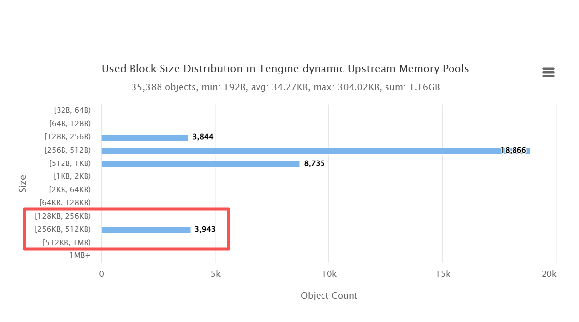 問題が dynamic upstream 関連のメモリプールに集中していることを確認した後、Glibcアロケータ層をさらに深掘りし、再度 OpenResty XRay を実行してメモリブロックのサイズ分布を分析しました。