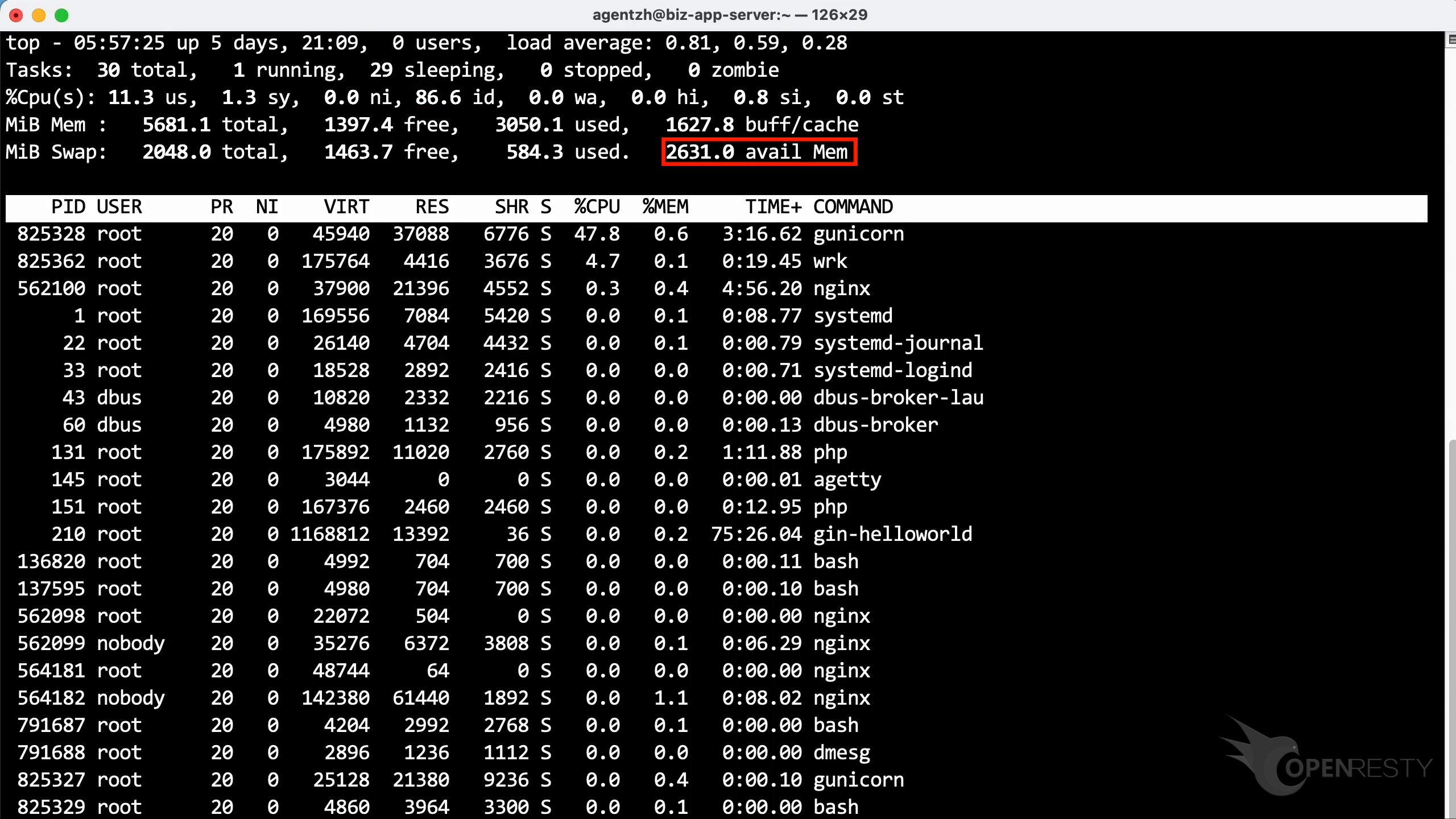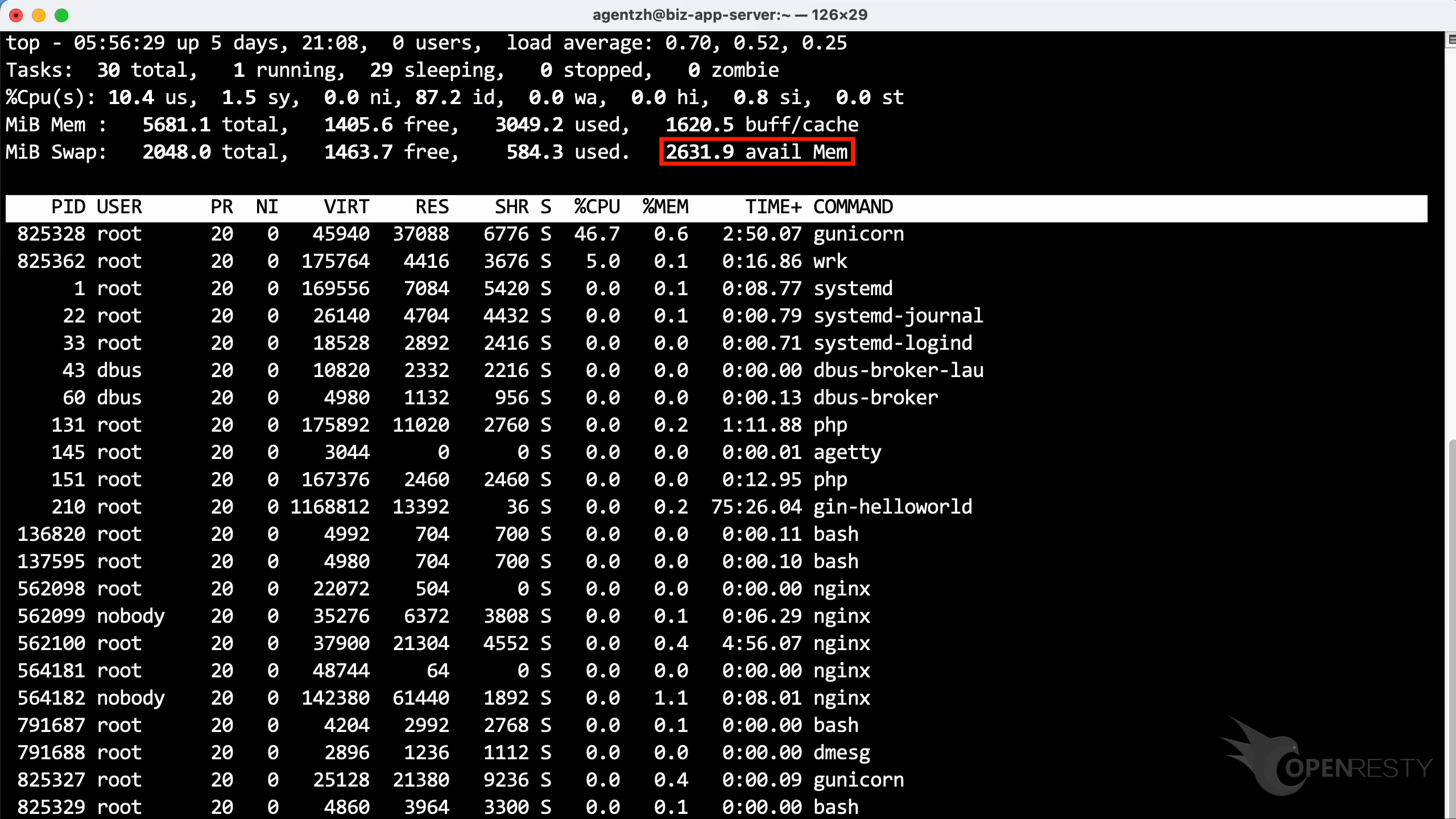 ベースラインを確立するため、アナライザーの実行前に top コマンドでシステムのパフォーマンス基準値を取得しました。以下の図に示すとおり、対象の gunicorn プロセス(Pythonで実装されたアプリケーション)のCPU使用率は約 46.5% で、システム全体の直近1分間のロードアベレージは 0.7、CPUアイドル率は約 87.2%、空きメモリは約 2632 MB でした。