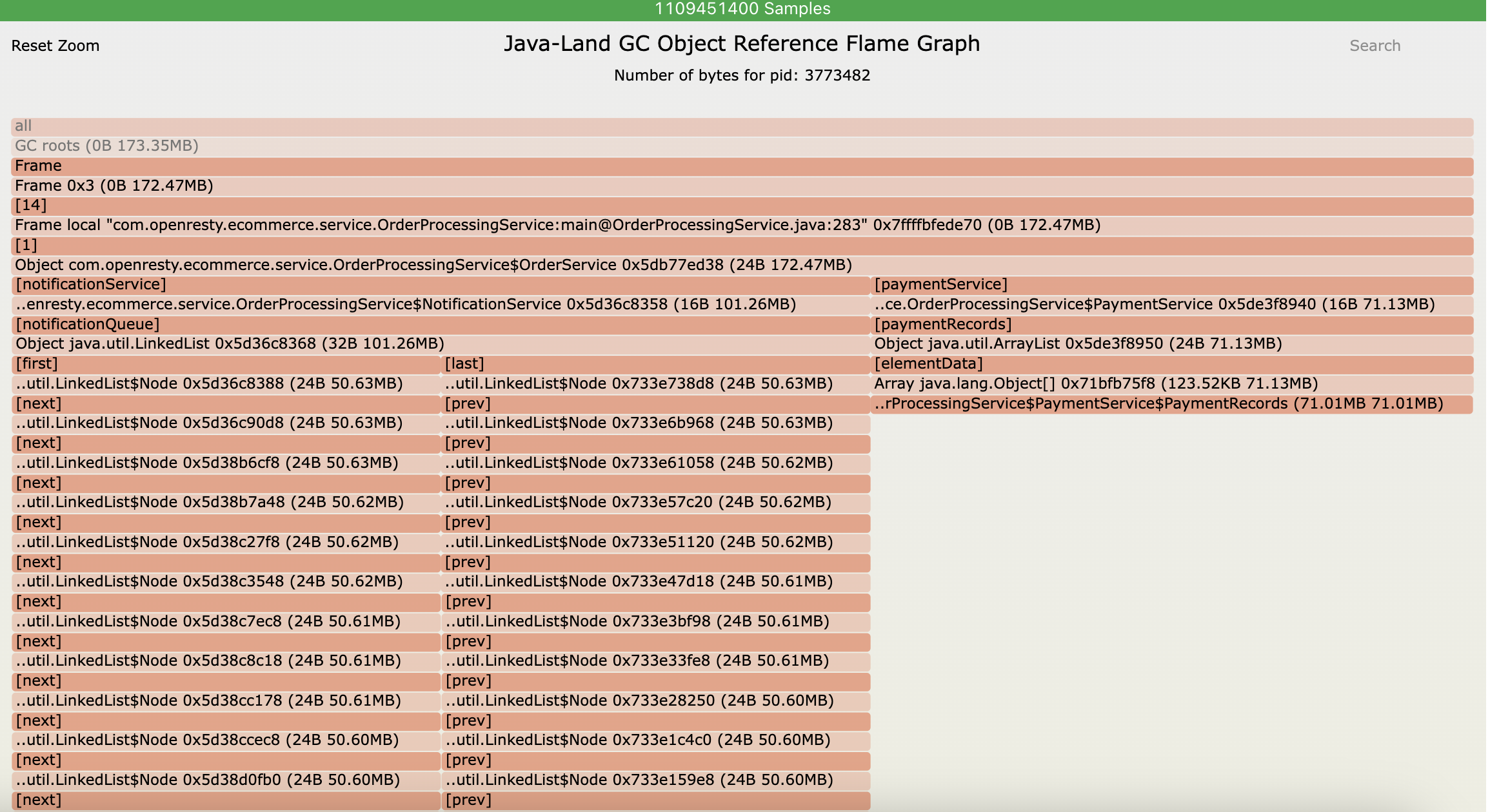 最初の重要なタスクは、メモリリークが存在するかどうかを確認し、その発生源を特定することです。OpenResty XRay の GC オブジェクト参照関係アナライザーを使用しました。