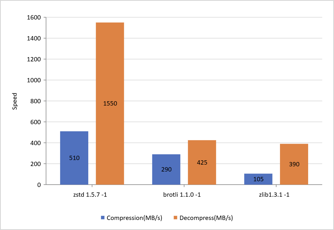 在高併發場景中,例如 CDN 邊緣實時壓縮響應,gzip 的 CPU 佔用可能成為隱藏的成本。從下面的基準測試結果可以清晰看到 zstd 顯著快於 Brotli 和 gzip。