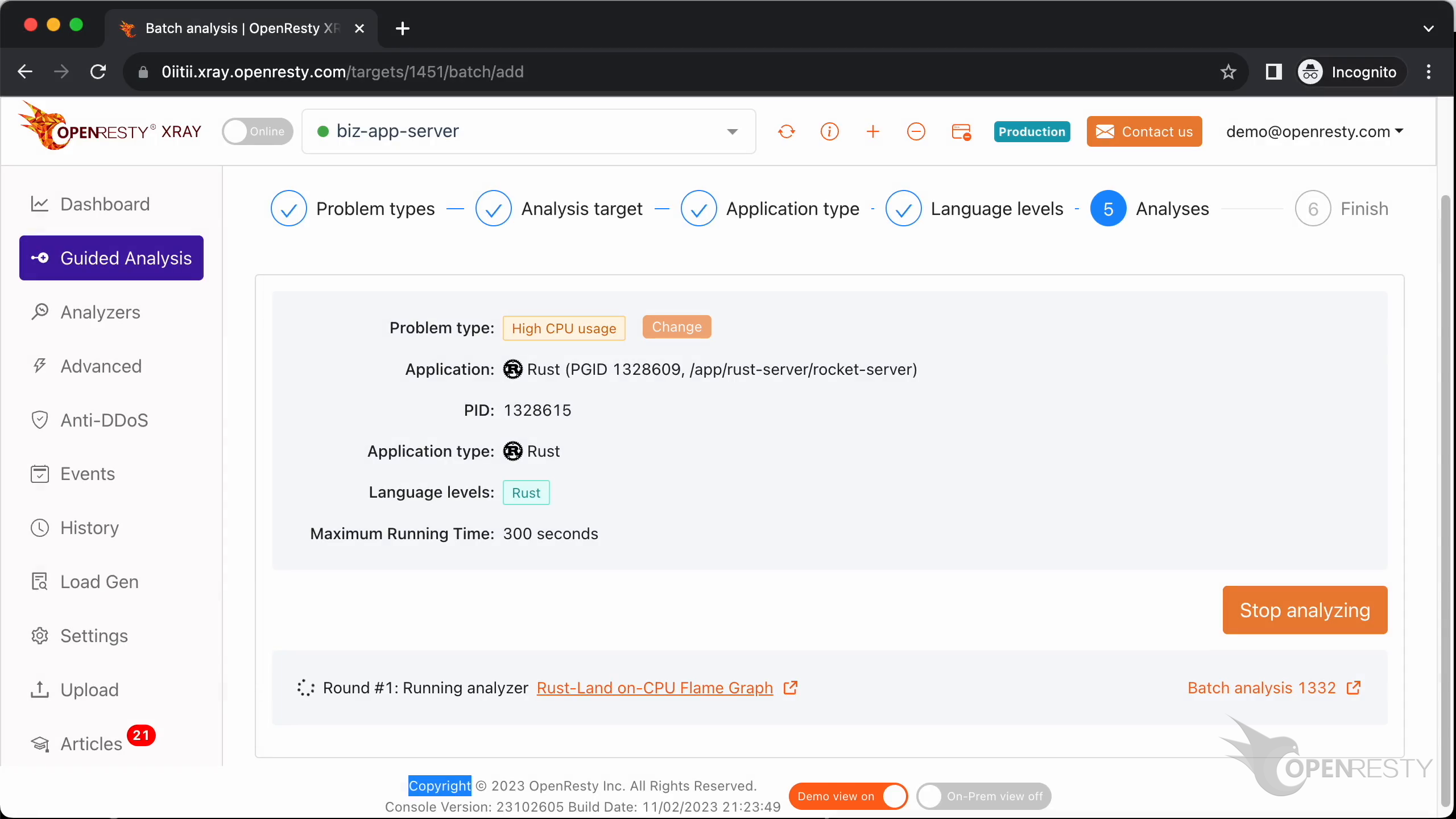 為模擬真實診斷場景,我們透過 OpenResty XRay 控制檯,在生產模式下,針對該 Rust 程序發起了一次持續 300 秒(5 分鐘)的 “High CPU usage” 場景分析(路徑:Guided Analysis → High CPU usage → 選擇目標程序)。